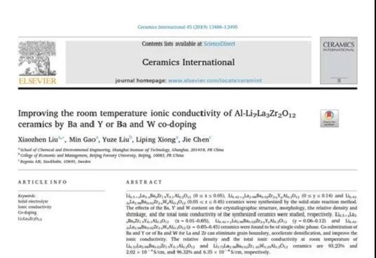 刘小珍教授团队,采用固相法成功制备了Ba,Y-LLZO和 Ba,W-LLZO导电陶瓷。研究发现,一定数量的Ba,Y和Ba,W掺杂剂能使该导电陶瓷消除晶界、大幅度提高其致密度和锂离子导电率。该研究以题为《Improving the room temperature ionic conductivity of Al-Li7La3Zr2O12 ceramics by Ba and Y or Ba and W co-doping》的论文发表在Ceramics International(一区)期刊上。