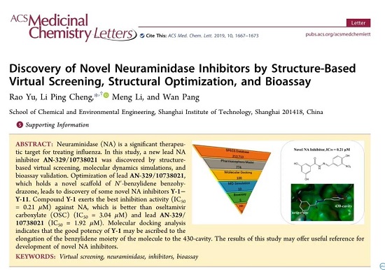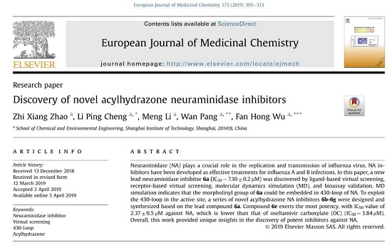 程利平副教授课题组近年来一直致力于抗禽流感病毒新药的研发。近期,基于虚拟筛选和构建药效团模型技术,该课题组成功研发出了一类新型酰腙类神经氨酸酶(NA)抑制剂。部分抑制剂抑制NA的活性优于目前临床常用的抗流感病毒药物奥司他韦(达菲)。相关研究分别以题为《Discovery of novel acylhydrazone neuraminidase inhibitors》、《Discovery of Novel Neuraminidase Inhibitors by Structure-Based Virtual Screening, Structural Optimization, and Bioassay》的论文发表在European Journal of Medicinal Chemistry(一区)和ACS Medicinal Chemistry Letters(二区)期刊上。