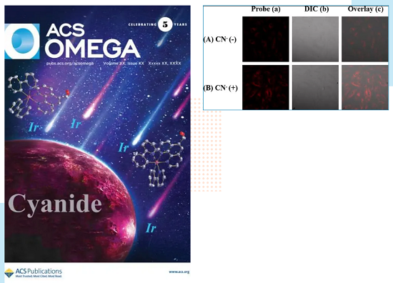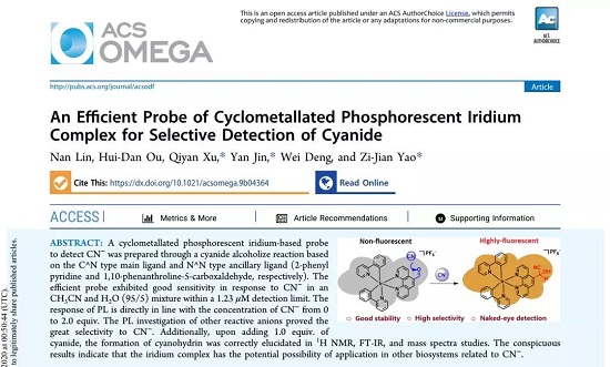 姚子健副教授指导的17级研究生林楠以2-苯基吡啶和联吡啶类化合物为配体,成功制备了过渡金属铱配合物荧光探针,该探针可实现高效高选择性的实现氰根离子检测。研究发现,随着氰根离子的加入,探针的荧光强度明显增强,可用于生物活体检测和实际的微量试纸测试。该工作以题为“An Efficient Probe of Cyclometallated Phosphorescent Iridium Complex for Selective Detection of Cyanide”的论文发表在ACS Omega(三区)上,并被选为当期封面文章(Front Cover)。这项工作对开发一种简单检测氰化物的荧光探针具有重要意义。