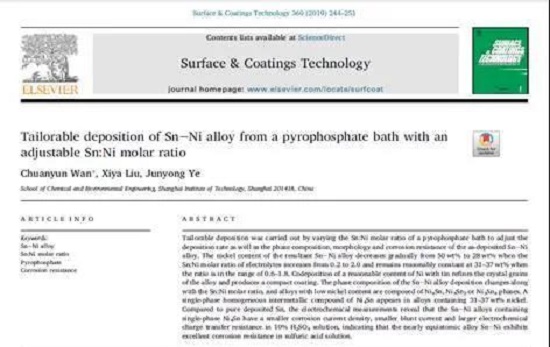 万传云教授课题组在焦磷酸盐体系中研究了镀液中锡镍金属离子的比例变化对锡镍合金组成的影响。研究发现,锡镍离子比例的改变可以实现合金组成的有效调控。该工作的结果是可以在较宽的锡镍离子比例下获得组分相对稳定的合金镀层,减少了合金镀层组成对镀液中离子数量变化产生的依赖,该镀层在酸性和中性溶液中均具有优良的耐腐蚀性。此工作的部分内容以Tailorable deposition of Sn-Ni alloy from a pyrophosphate bath with an adjustable Sn:Ni molar ratio发表在专业期刊Surface & Coating Technology 上,该期刊坚持发表原创性成果,在行业影响力上升很快。2020年中科院SCI期刊分区中,该刊从工程技术类3区划归材料科学类1区。