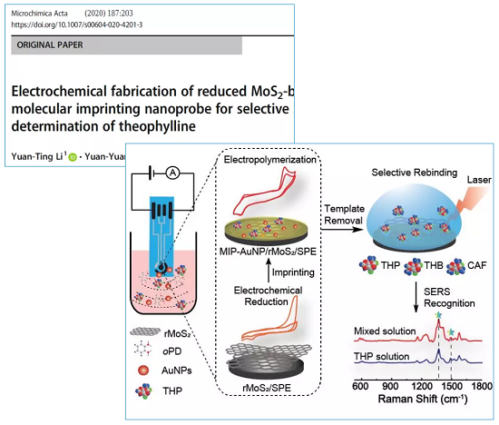 李原婷课题组开发了一种新型的MIT-SERS探针。利用绿色的电化学制备技术,在薄层二硫化钼修饰的丝网印刷电极表面一步电聚合邻苯二胺单体,茶碱分子和电还原SERS活性的Au纳米颗粒,形成三维多孔结构的分子印迹SERS聚合物。研究表明,该探针制备过程简单快速,对茶碱表现出较好的选择性和灵敏度,检出限低至0.01 nM。当于生物碱类物质咖啡因和可可碱共存时,探针表现出低的SERS干扰,可用于茶饮料中茶碱的选择性检测。此探针的合成方法也可拓展至其它MIT-SERS基底的制备。该论文发表在分析化学类期刊Microchimica Acta(二区) 上。这项工作将MIT与SERS技术相结合,能有效提高分析方法的选择性和富集能力。