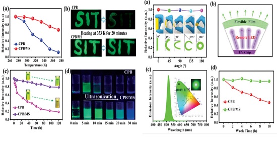 在新型钙钛矿量子点等发光材料研究领域,房永征教授、刘玉峰副研究员与中科院上海技术物理研究所合作,将钙钛矿量子点均匀生长于介孔氧化硅孔道内,复合物CsPbBr3/m-SiO2粉末光致发光量子产率显著提高,并制备了柔性发光二极管器件,实现了远程发光。研究成果发表在Nanoscale上,影响因子为6.97。