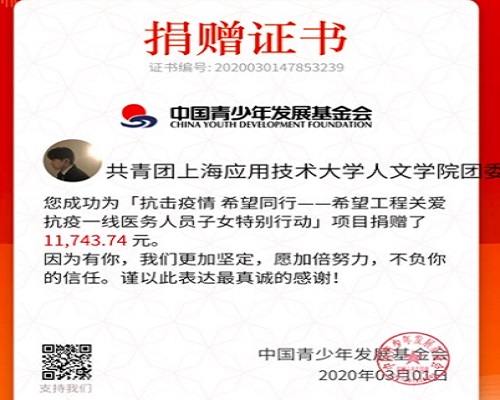 新年伊始,“新冠”来袭,不断蔓延的疫情时刻牵动着人心。在疫情防控的关键阶段,人文学院党总支向每一位师生党员发出自愿捐款的倡议,弘扬“天下兴亡,匹夫有责”的担当精神,为疫情防控助力。人文学院团委积极响应党总支的号召,开展了关爱抗疫一线医务人员子女特别行动。募捐活动充分尊重组织成员个人意愿,秉持自愿原则,量力而行。学生们在接到各班团支书的通知后,反响热烈,自愿通过支付宝、微信等形式踊跃捐款,支持疫情防控工作,为抗疫一线医务人员的子女们送去关心和爱心补助。最终,全院各团支部自愿捐款总数达到11743.74元,以学院团委的名义统一捐款给了中国青少年发展基金会。