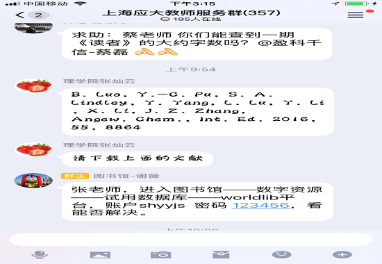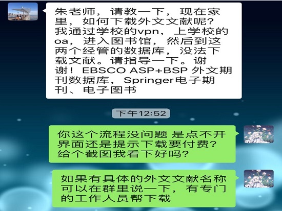 抗疫时期,线上教学和科研的需求使得教师们更加密集频繁地使用网上资源。对此,图书馆闭馆期间坚持馆员值班制,及时线上解答读者咨询。手机微信已作为图书馆办公平台,更快捷更方便地联系馆员与读者,积极为广大师生的教学科研活动提供高质量的线上服务。