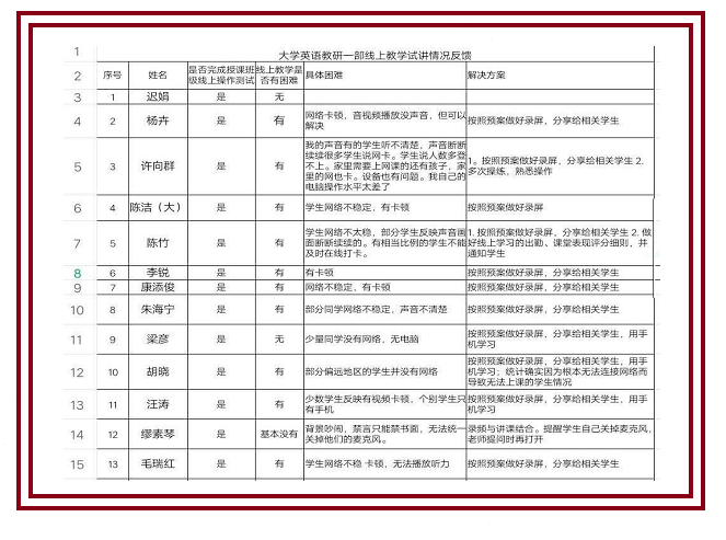 一是摸清3月2日开始的三天内有课的教师名单。经统计学院共有78位教师此期间有课,其中大学英语公共基础课教师54位,英语和德语专业课程任课教师24位,基本覆盖了所有的大学英语公共基础课和专业课教师。