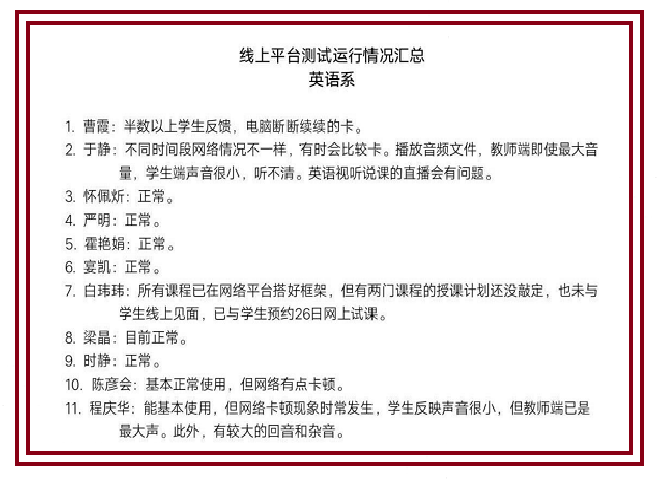 三是学院开始收集每位教师线上试讲的情况反馈,对反映较多的问题进行集中处置,对线上教学有困难的教师提供帮助。在线上教学试运行活动中,学院发现,多数教师反映的问题在于:网络不稳定造成部分课程音视频播放效果不佳;操作不熟练引起的课堂杂音干扰等。