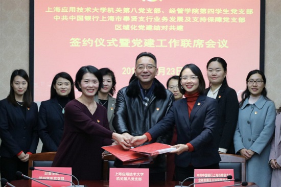 12月23日,机关第八党支部、经管学院第四学生党支部与中国银行上海市奉贤支行业务发展与支持保障党支部开展区域化党建结对共建签约仪式暨党建工作联席会议在校举行。机关第八党支部书记袁翔主持,经管学院党总支书记王真、中国银行上海市奉贤支行高级客户经理黄璐,机关第八党支部、经管学院第四学生党支部、中国银行上海奉贤支行业务发展与支持保障党支部相关代表一同参加会议。
