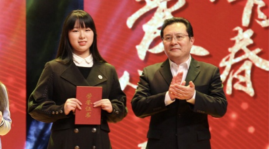 12月6日,我校师生参加2019年上海市学生资助育人成果展演。在展演中的国奖、市奖、国家励志奖学金颁奖环节,上海市教卫党委书记沈炜为我校获奖学生代表国家奖学金获得者郭雨同学颁发荣誉证书,同样为我校争得荣誉的还有资助宣传大使戴华丽同学。她们在学习生活中自律自强、不卑不亢,展现了上应学子奋力拼搏的良好风貌。