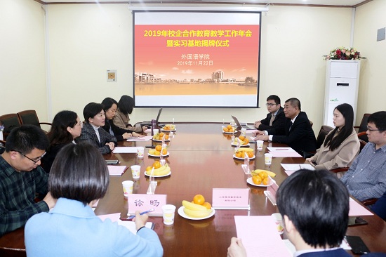 11月22日,外国语学院举行2019年校企合作教育教学年会暨实习基地揭牌仪式。上海科大讯飞信息科技有限公司、中译语通信息科技(上海)有限公司、上海一者信息科技有限公司、上海世语翻译有限公司、上海樱通翻译服务有限公司、上海文策翻译有限公司等企业代表应邀出席,外国语学院党政班子及教师代表参加会议,学院副院长于静主持。