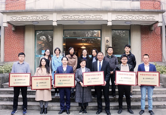 李晓晶代表学院与六家企业代表为“实习基地”揭牌。同时学院还与上海樱通翻译服务有限公司、上海文策翻译有限公司签订(续签)了实习基地共建协议等文件。