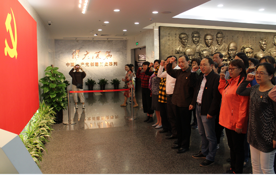 在一大会址,全体党员面对党旗,一起重温入党誓词。铿锵有力的宣誓声响彻大厅,让现场所有人都深受感染。宣誓完毕,大家怀着庄严肃穆的心情认真观瞻每一幅图片,静静沉思、默默体悟,感受历史场景,聆听时光回响,追忆了中国共产党在白色恐怖下,艰难诞生、不断发展、日渐壮大的风雨岁月,更加深入地了解中国共产党98年来走过的辉煌历程。