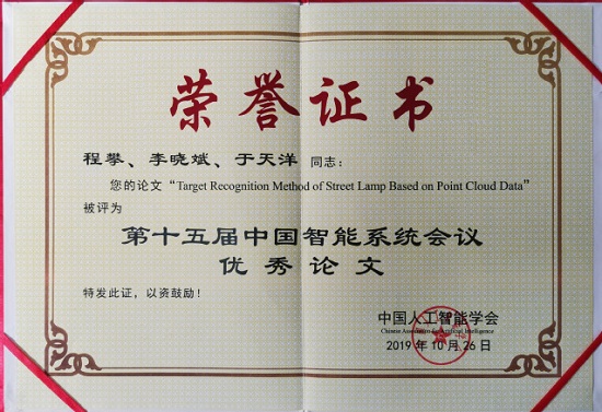 10月26日至27日,由人工智能学会主办、中国人工智能学会智能空天系统专业委员会协办,海口大学与北京航空航天大学共同承办的第十五届中国智能系统会议在海口举办。我校电气学院研究生程攀、于天洋(导师李晓斌教授)的论文《Target Recognition Method of Street Lamp Based on Point Cloud Data》荣获中国人工智能学会颁发的“第十五届中国智能系统会议优秀论文奖”。此荣誉的获得,体现了该学科研究生的培养和学术研究水平得到了国内同行的认可与肯定。