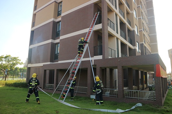 本次灭火疏散演习分为疏散逃生演习和灭火消防技能培训。演习现场,模拟25号学生宿舍楼因用电不当突发“火灾”,窗口浓烟滚滚,学生被困宿舍内呼救,并向119指挥中心报警。随着警报声响起,星火消防中队救援车辆驶近“火场”开始救援,消防官兵现场演示了高压水枪灭火、架设云梯救人等科目。四百多名演习学生用毛巾捂鼻,在疏散引导员、保卫干部、辅导员的引导下开始迅速从宿舍楼内撤离到安全区域。