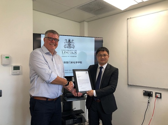 林肯大学访问教授(Visiting Professor)旨在授予那些具有公认学术专业地位的人士,他们将为林肯大学相关院系在专业学科领域的学术工作及发展提供尽可能多的指导意见和建议。胡晓钧教授是英国林肯大学化学学院首位外籍访问教授,由林肯大学化学学院院长思科文(Ian Scowen)颁发访问教授证书。