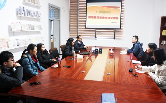 1月15日,外国语学院召开了2019年国家社科基金申报交流会,学院拟申报2019年国家社科基金项目的老师及部分青年教师参会,院长陈家旭表示,申报国家社科项目对个人学术素养、学院学科建设及学校事业发展的紧密关系,鼓励大家要高度认识项目申报工作的重要性和紧迫性。获批2018年教育部人文社科基金规划项目的高晓倩就自己申报课题的心得和大家进行了交流,就申报文本的选题依据、研究内容、思路方法、创新之处等方面做了细致讲解。程庆华博士根据自己申报基金项目的经验,从选题、项目论证以及申报书撰写的细节等方面和大家进行了探讨。