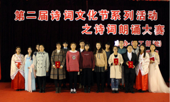 11月29日,由校学工部(处)主办,人文学院承办的“诵读经典诗文 传承华夏文明”校第二届诗词文化节之诗词朗诵大赛举行,来自各学院的同学积极参加。参加者们朗诵了荡气回肠、慷慨激昂的《满江红》、《祖国啊,我亲爱的祖国》、《祖国抒怀》;深沉宁静的《小石潭记》、《春江花月夜》;感情跌宕的《行路难》;婉转哀伤、缠绵悱恻的《声声慢》、《预言》、《雨霖铃》;情真意长、真挚隽永的《再别康桥》、《锦瑟》、《我愿意是急流》;奔放郁勃的《贺新郎·同父见和再用韵答之》;豪迈洒脱的《将进酒》、《梦游天姥吟留别》,使听众不由得与诗人的情感命运碰撞,共同领略诗词的意蕴和美感。最后,鲁班书院荣获一等奖,轨交学院和外国语学院荣获二等奖,生态学院、外国语学院和轨交学院荣获三等奖。