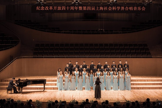 11月20日,由上海市社会科学界联合会主办的“纪念改革开放四十周年暨第四届上海社会科学界合唱音乐会”在东方艺术中心音乐厅举行,我校大学生艺术团合唱团作为唯一一支学生合唱团受邀参演。艺术团合唱团演绎了《城南送别》和《我喜欢》两首作品,洋溢着青春的旋律,展示了合唱团的精神风貌。