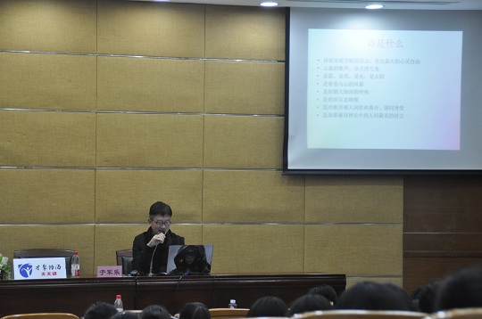 11月17日,由学工部(处)主办、人文学院承办的第二届诗词文化节系列活动之“关于写诗那点事——对诗歌的认识与上海滩诗会的诗歌文化”讲座举行,上海滩诗会创始人、诗人于军乐应邀主讲。各学院师生共计200余人听取讲座。