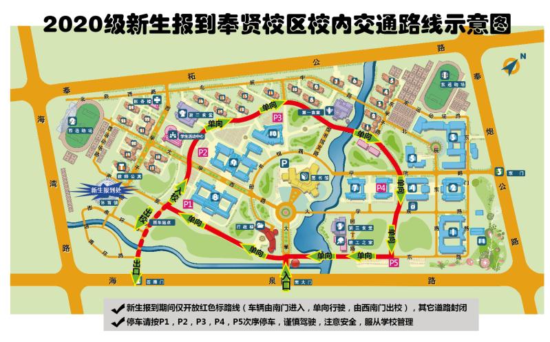 二、奉贤校区校内交通实行临时管控,管控时间为:7:00-17:00。临时管控期间,校园内环路实行单向行驶,车辆自南门进入学校后沿“南辰西路—环西路—环北路—环东路—南辰东路”顺时针方向单向行驶,由西南门出校。(另附:2020级新生报到奉贤校区校内交通路线示意图)