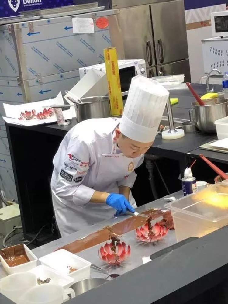 比赛前,江雪利用周末的时间不断练习,从做完一整套需要一下午,一直到比赛前可以提前半小时完成制作。 但是在比赛中还是有意想不到的事发生。由于比赛场地的极速冷冻箱功率不够,蛋糕迟迟冻不住,别说完成比赛,甚至都不能交出作品,当时江雪都快绝望了。 赛事主办方及时提供了干冰,但因为蛋糕体冷冻时间延长,江雪不得不快速调整制作顺序,力求不浪费一分一秒,最后赶在比赛结束前上交了作品。 “比赛比的不只是技术,还有时间规划,统筹能力。通过这次比赛我也认识到了在技术的道路上永无止境,接下来要继续努力,做一个更好的自己。”