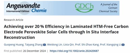 近日,我校化学与环境工程学院张太阳副教授与李向清教授课题组在基于碳电极的无空穴传输层钙钛矿太阳能电池研究领域取得重要进展,相关成果发表在化学领域顶刊Angew. Chem. Int. Ed.上,论文第一作者为化工学院2022级研究生黄国鹏,张太阳副教授和李向清教授为论文通讯作者,我校为唯一通讯单位。