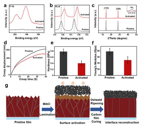 鉴于此,我校科研团队提出了利用机械化学原位重构碳电极与钙钛矿界面的策略。研究首先使用甲胺氯盐对钙钛矿薄膜表面进行化学活化,氯离子和甲胺离子的引入使得表面的钙钛矿转化成非晶态的中间相,纳米压痕测试表明中间相的生成显著降低了钙钛矿薄膜的硬度,提升了薄膜的可塑性。在将碳膜机械热压到活化后的钙钛矿表面时,中间相开始重新结晶为钙钛矿,该过程中钙钛矿通过奥斯瓦尔德熟化生长为结晶性更好、晶粒更大的钙钛矿薄膜。更重要的是,在压力和温度的驱动下,钙钛矿薄膜的再生长过程与碳膜的固化可以同步进行,利用二者的可塑性动态重构了两者之间的界面,有效解决了因界面接触导致的器件效率低下难题,将基于层压碳膜的无空穴传输层钙钛矿太阳能电池的效率提升到20%以上。上述将机械压力与化学活化结合的策略为钙钛矿太阳能电池的界面调控提供了新的思路和选择。