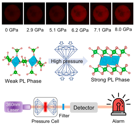 压力敏感发光材料在航空航天、深地深海工程、高压制造及重大装备等领域具有关键应用价值。极端环境,如高压、高温等对材料的发光稳定性、响应可靠性等提出了更高要求。在高压发光与压力传感方向,我校研究团队联合北京高压科学研究中心,基于零热膨胀晶格构建了具有反常压力猝灭特性的稀土掺杂发光材料。该材料在7.2GPa的极端条件下表现出7倍于常压条件下的发光增强。研究团队进一步开发了光学压力报警器件。相关成果以“High-pressure sensing using zero-thermal expansion phosphor with anti-quenching behavior”为题发表于《Device》(2025 4, 101020; https://doi.org/10.1016/j.device.2025.101020)。