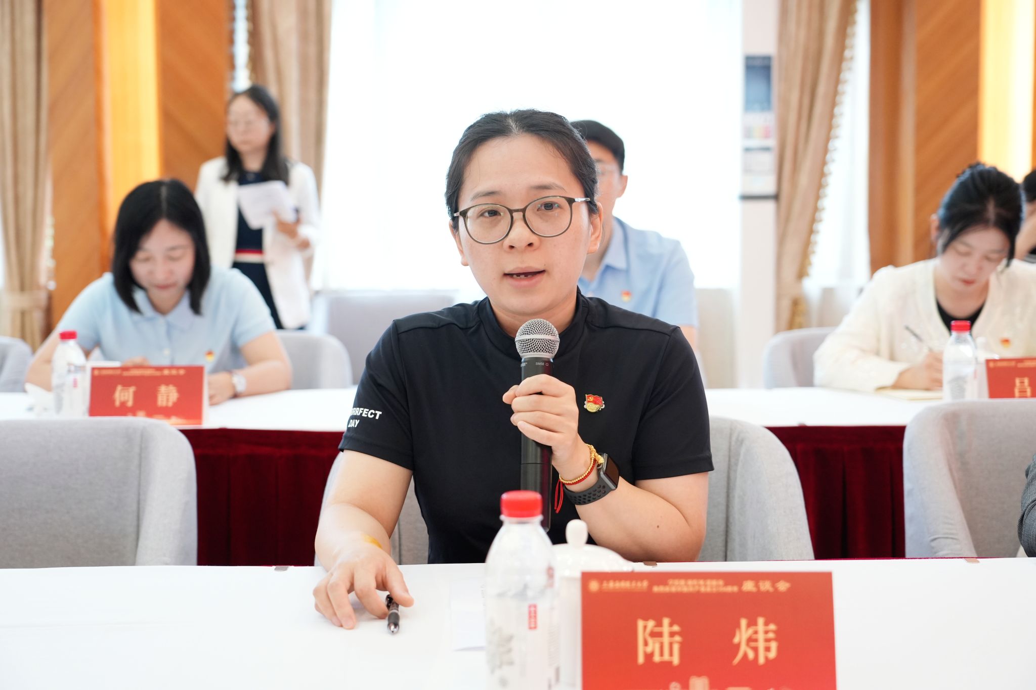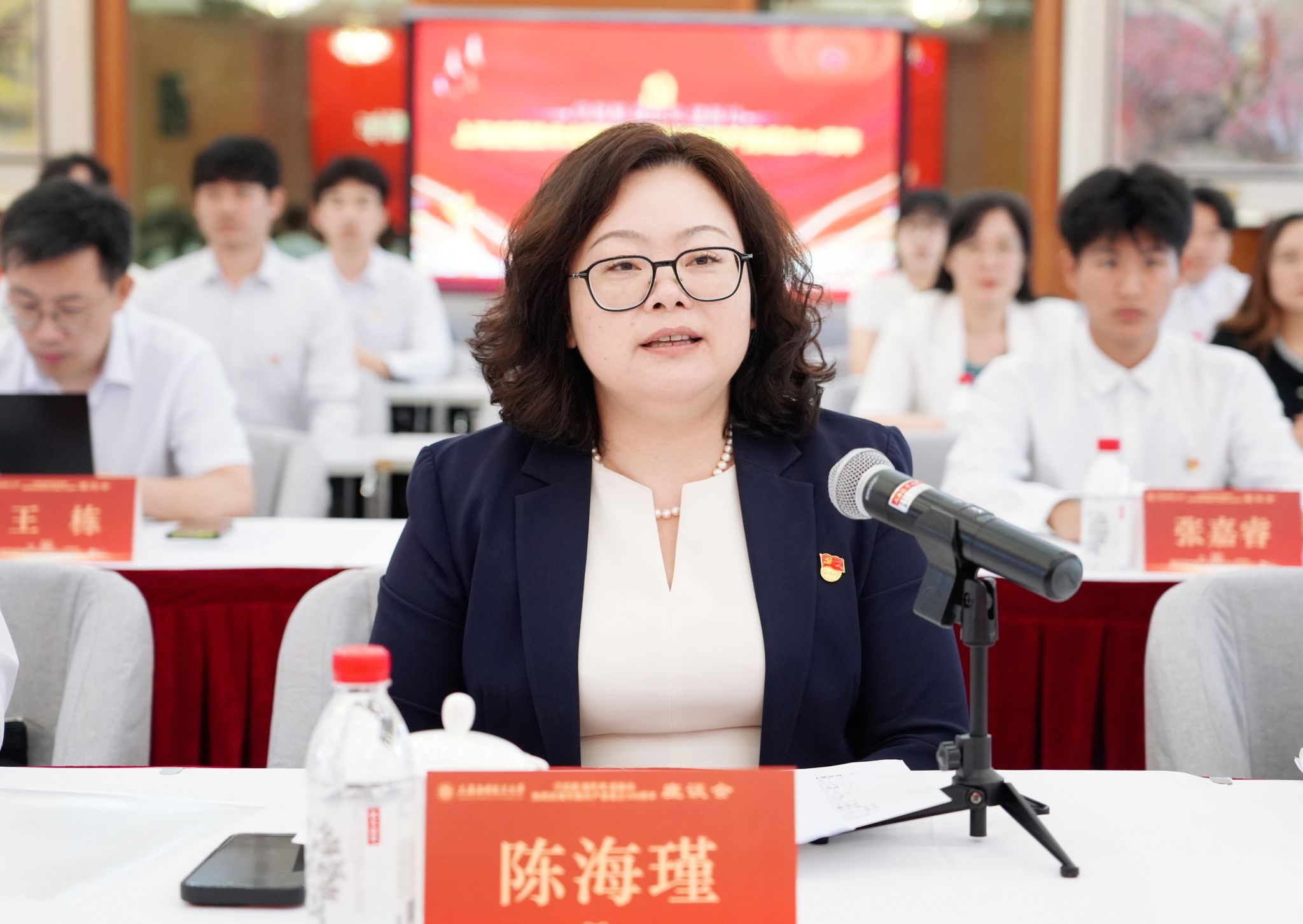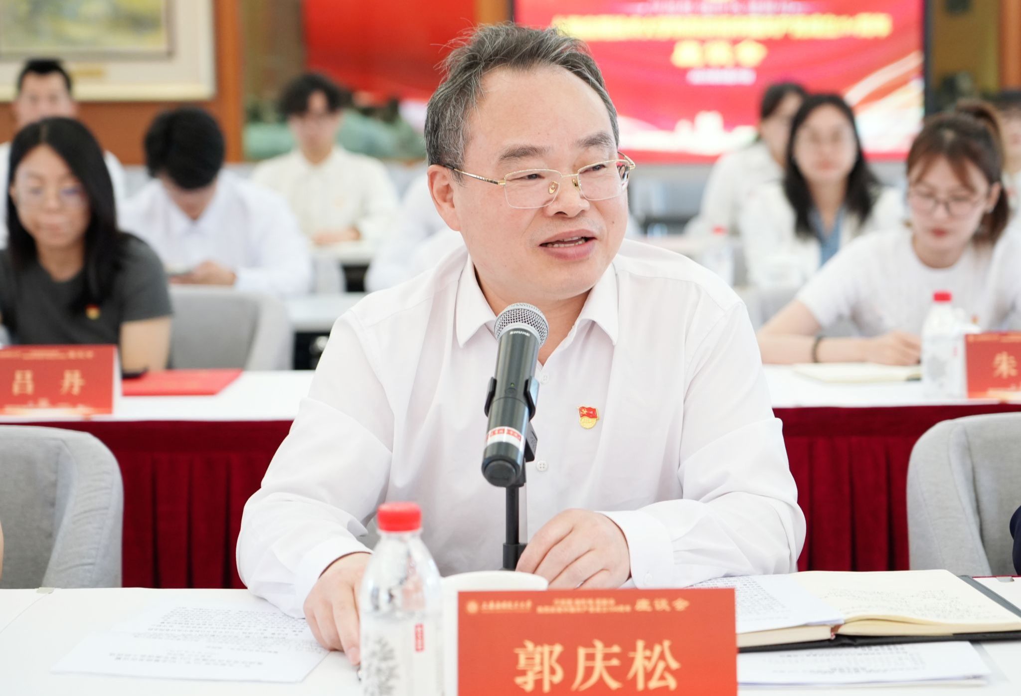 在喜迎中国共产党成立104周年之际,6月25日,学校举行“学思想、强作风、建新功”主题座谈会。校党委书记郭庆松出席并讲话。校党委副书记陈海瑾主持座谈会。校党委副书记、纪委书记、监察专员李健,校党委常委、副校长、党委组织部部长王占勇出席,党群部门负责人、二级党组织书记、党务工作者及党员师生代表齐聚一堂,重温初心使命,共话时代担当。