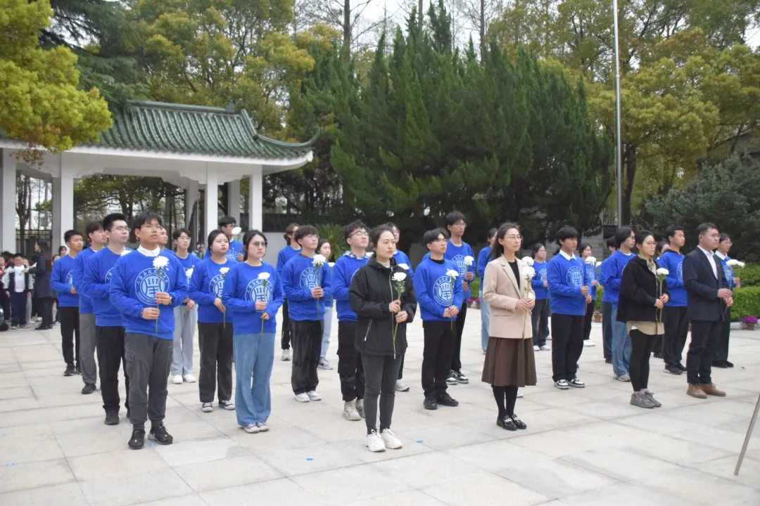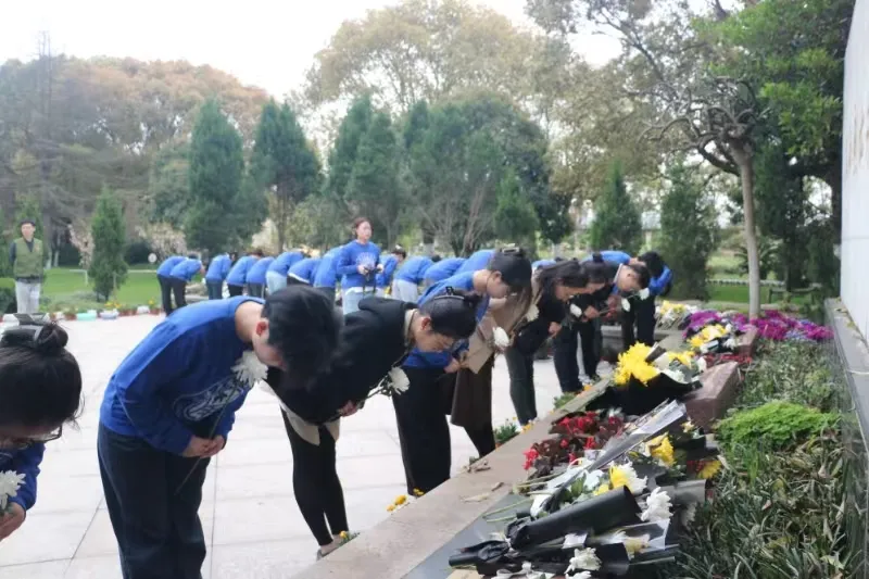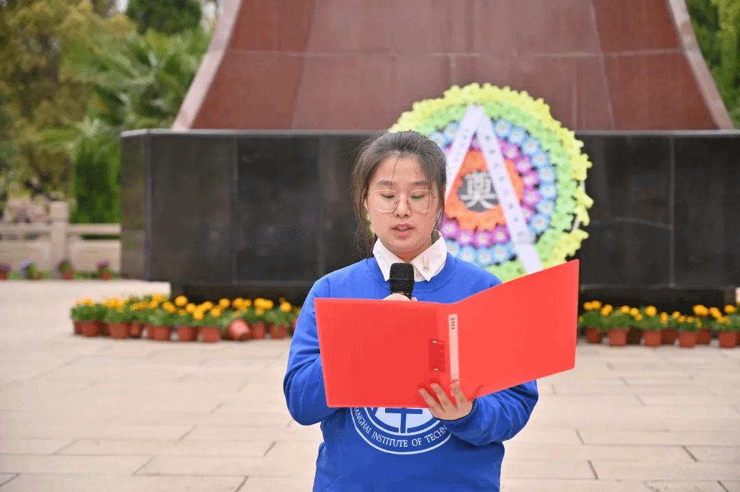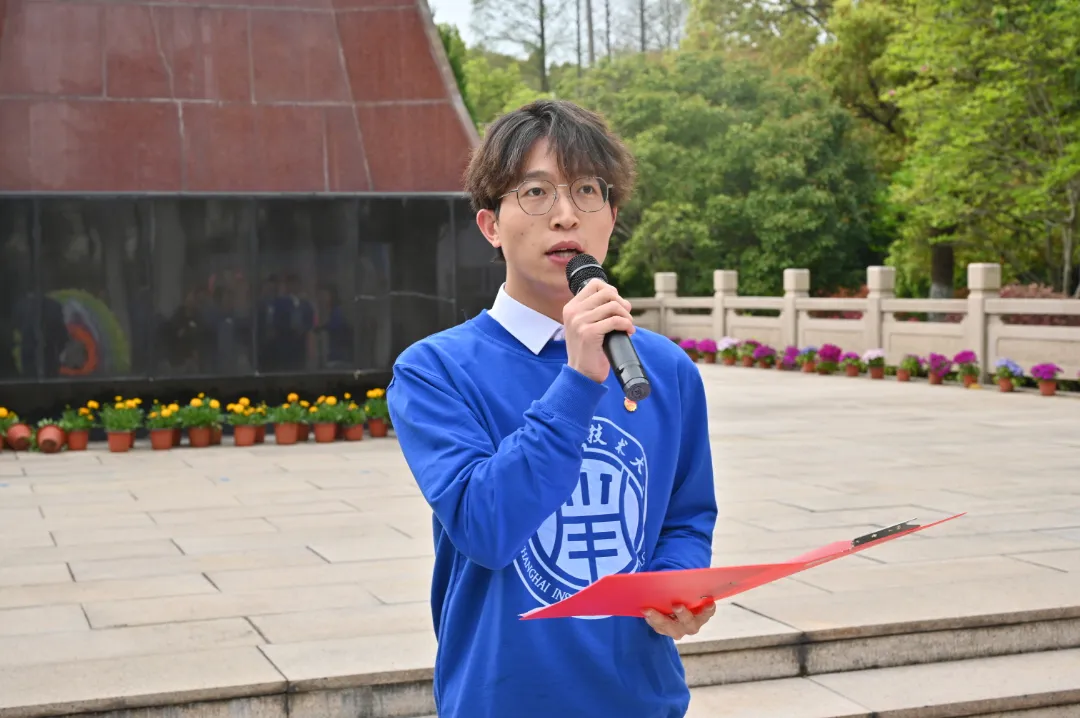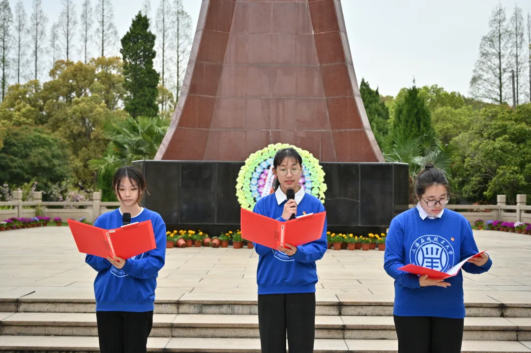 苍松翠柏掩映下的奉贤烈士陵园显得格外庄严肃穆,师生们来到纪念瞻仰区举行悼念仪式。在纪念碑前,全体师生怀着无比崇敬之情,面对纪念碑肃穆而立, 向革命先烈默哀,并向纪念碑敬献花篮和鲜花。5名学生代表通过宣读祭文、诵读奉贤烈士名单、诗歌朗诵等形式,表达上应青年对革命先烈的敬仰之情。