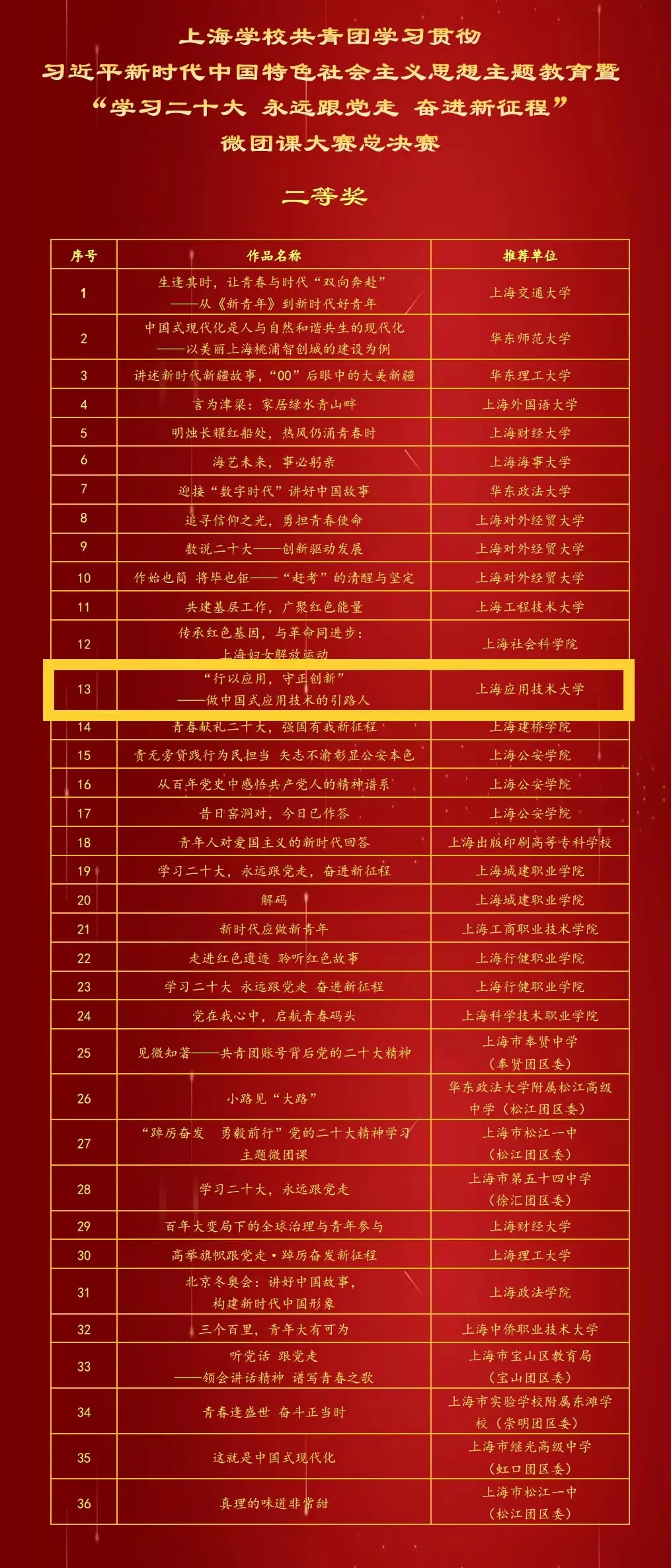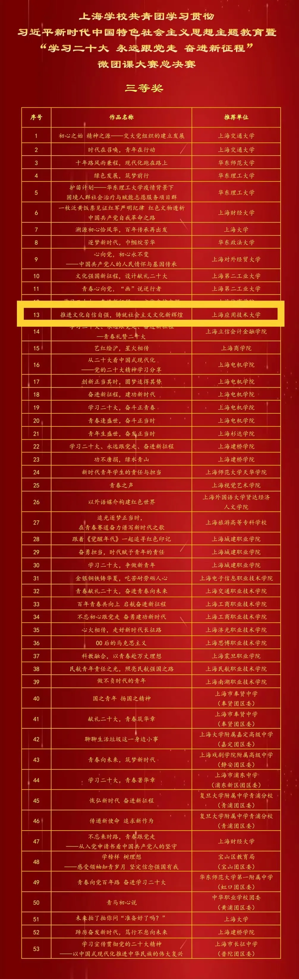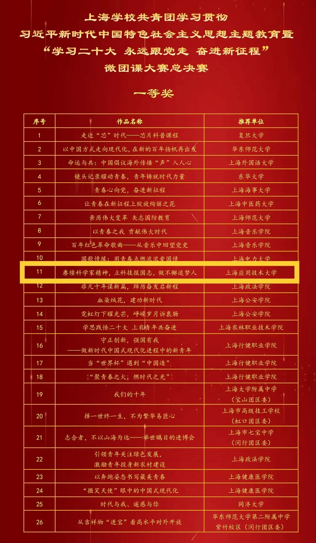 近日,由共青团上海市委员会、上海市学生联合会主办的上海学校共青团学习贯彻习近平新时代中国特色社会主义思想主题教育暨“学习二十大 永远跟党走 奋进新征程”微团课大赛总决赛在华东师范大学举行。我校团委积极组织师生参与,共有3件作品从中脱颖而出荣获佳绩,其中一等奖1项,二等奖1项,三等奖1项。