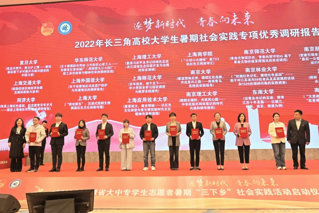 4月24日,由安徽、上海、江苏、浙江三省一市团委、学联共同开展“红色江山红色路 青春力量青春行”2022年长三角高校大学生暑期社会实践专项活动总结表彰仪式在安徽省宣城市召开,经济与管理学院和光同芥小队实践团的《星星炬火,微光明城——以红色文化阅读为索引探究新时代文化精神传承新道路》项目获优秀团队和优秀调研报告奖。