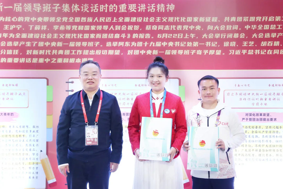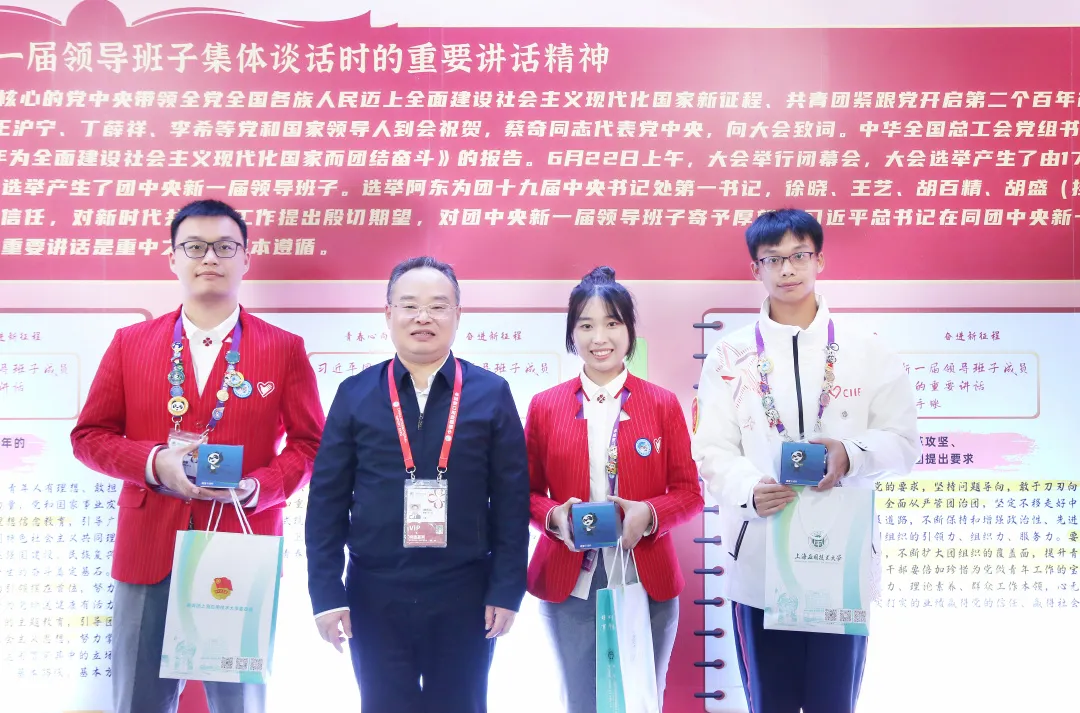 郭庆松为长期岗志愿者张亦唯、老挝留学生志愿者邓涛、三名在进博会期间过生日的志愿者以及志愿者骨干代表赠送了慰问品,鼓励他们充分发挥模范带头作用,为学校、为进博、为国家增光添彩。