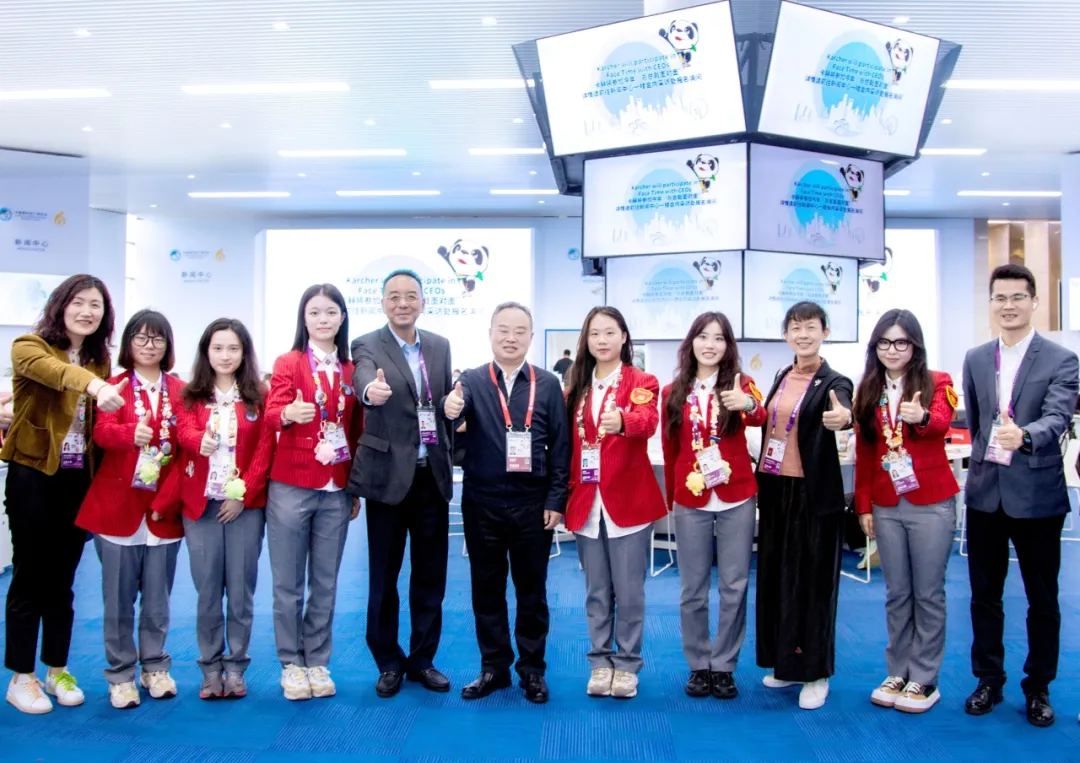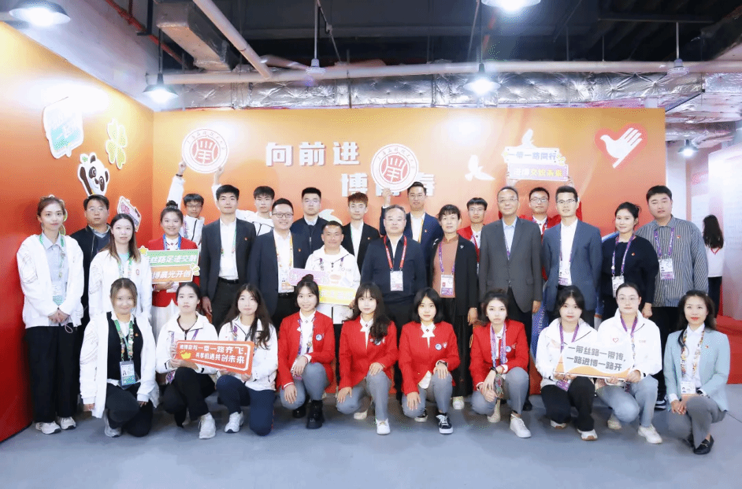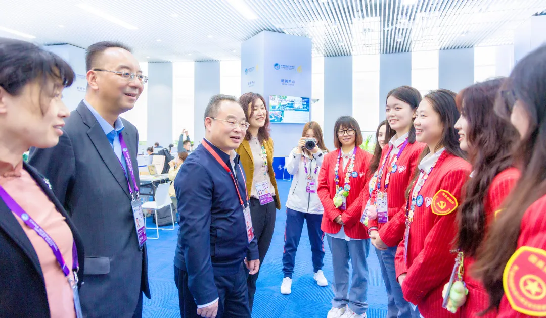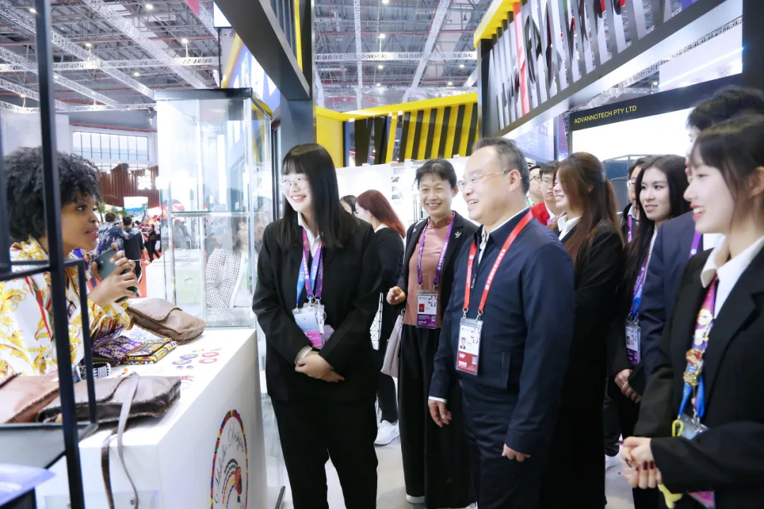 郭庆松前往国家馆的南非馆,慰问为南非国家展馆展商提供现场口语翻译的外国语学院学生志愿者。他希望大家认真对待每一次交流的机会,争做促进交易的一片绿叶。