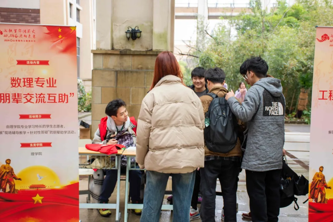 理学院志愿者队集合了数理专业学习优秀的学生志愿者,现场开展“辅导教学+针对性答疑”的朋辈助学活动。