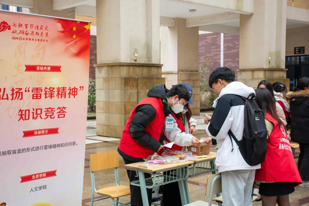 人文学院志愿者队开展弘扬“雷锋精神”知识竞答,以抽取盲盒的形式进行雷锋精神知识问答。