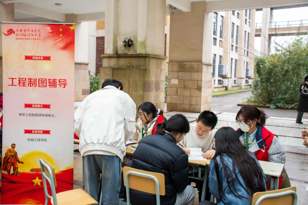 机械学院志愿者队围绕工程制图课程内容,开展现场辅导教学、答疑助学。