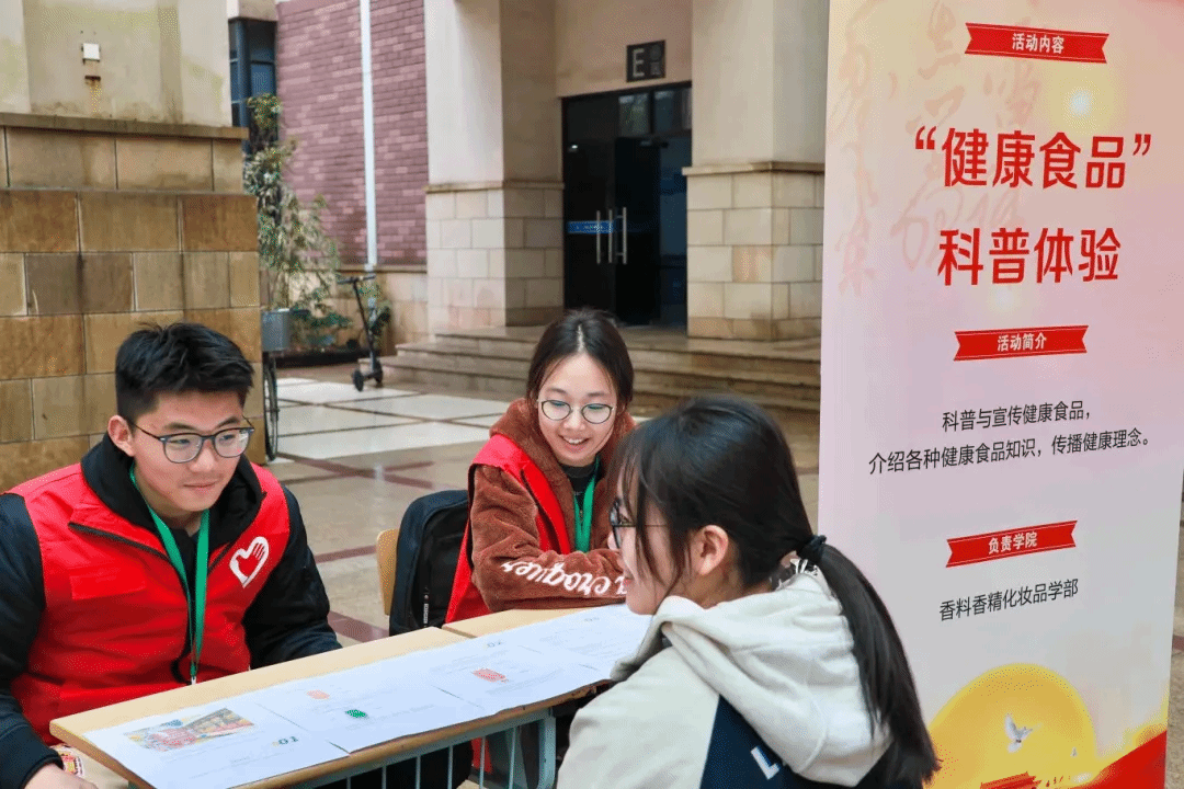 香化学部志愿者队依托食品专业背景,向同学们科普与宣传健康食品,介绍各种健康食品知识,传播健康理念。