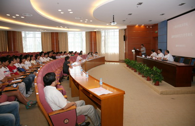 院长卢冠忠代表学校对新同学表示热烈欢迎。卢冠忠简要介绍了学校的学科建设、科学研究等情况,指出学校将进一步加大对研究生创新能力的培养力度,正在制定优秀硕士学位论文培育计划及研究生在校期间科研成果奖励办法。