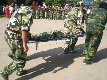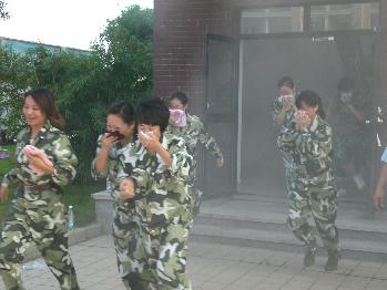 康年宣布“演练正式开始”。顷刻间,8号楼冒出滚滚黑烟,警铃骤响,学生纷纷用湿毛巾保护口鼻,冲出楼,有秩序地排队跑向安全地点。部分没有跑出的学生在二、三楼呼救,消防官兵迅速架设云梯冲上失火点,用灭火器扑救初起火焰。同时,急救人员冲进8号楼用担架抬出受伤人员,医生现场迅速组织包扎、人工呼救等抢救。部分消防官兵用高压水龙头向另一处失火点喷射,火势逐渐熄灭。楼内全面展开搜救工作。最终核实,参加演习的同学全部疏散至安全区域。整个演习有条不紊,圆满结束。演习后,奉贤消防支队星火中队官兵在现场作消防技能汇报。