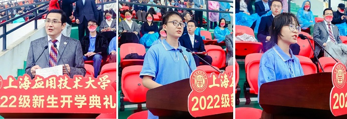 香料香精化妆品学部研究生王理壮作为研究生新生代表发言。他表示,将在上应大种下梦想与希望的种子,内强素质,外塑体魄;明确目标,自主创新;坚守初心,不懈奋斗,书写人生道路上的崭新篇章。材料科学与工程学院本科新生王秋晓表示,衷心感谢学校的周到安排、老师的关心关怀和学长的指导帮助,今后要以青春之姿搏击未来,在激情奋斗中绽放青春!