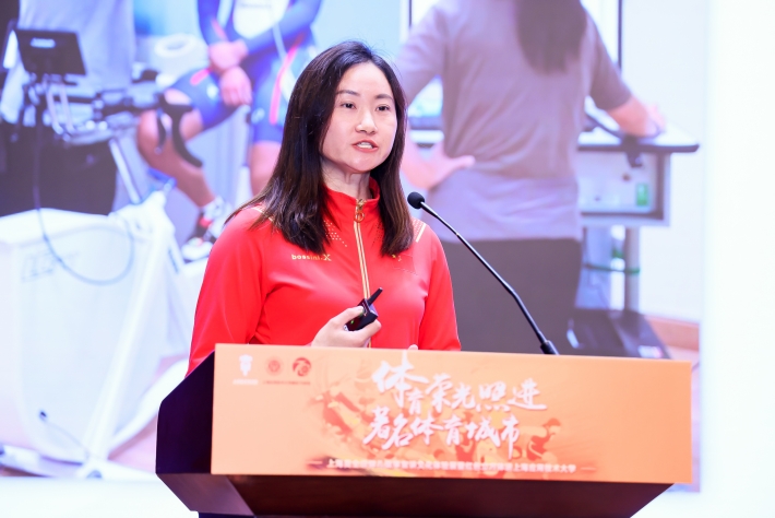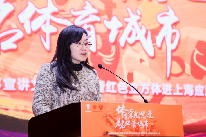 王瑛致欢迎辞,对活动主办方上海市体育局的支持表示感谢,对钟天使和上海体育宣讲团的到来表示欢迎。她指出,近年来学校的校园体育文化蓬勃发展,竞技体育人才培养成果显著,希望同学们用心聆听冠军们在挫折和坚持中涅槃成长的故事,汲取成长力量,在青春之路上奋力前行。王瑛表示,学校也将“红色立方体”作为学校迎校庆活动打卡点之一,希望同学们迈开脚步,在运动中锤炼意志品格,彰显拼搏精神,以实际行动为上海应用技术大学建校70周年这一具有纪念意义的时刻献礼。