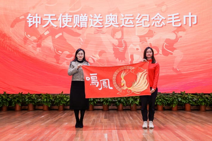 王瑛将我校学生创作的非遗漆艺作品《荷韵》赠予钟天使,钟天使将奥运同款鸣凤毛巾赠予学校,双方共同完成“红色立方体”开箱。