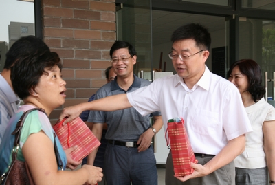 8月8日上午,院长卢冠忠、副院长叶银忠来到奉贤校区第三学科楼,慰问正冒着酷暑进行搬迁的香精香料技术与工程学院教职工。叶银忠代表校工会,送去防暑物品。校领导的慰问使教职工们倍受鼓舞,纷纷表示一定不辜负学校的期望,再接再厉以确保各项教学、科研设备在新学期开始时能正常投入使用。