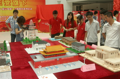 向中国共产党90华诞献礼,我校城市建设与安全工程学院100多名学生以“用手触摸党史,用心体验辉煌”为主题,选取了一大会址、遵义会议小楼、延安宝塔、杨家岭礼堂、天安门、人民大会堂等10个中国共产党前进道路上的重要地标建筑,制作出按比例缩小的仿真建筑模型。解放日报、青年报等媒体用较大篇幅对此进行了报道。详见: