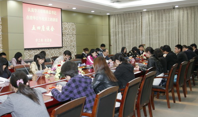 在“五四”青年节之际,我校学工部、团委以“认真学习胡锦涛总书记在清华大学百年校庆上的讲话”为主题召开“五四”座谈会,党委副书记、副校长康年出席座谈会并讲话。学工部部长、校团委书记、二级学院团干部以及辅导员代表参加了座谈会。