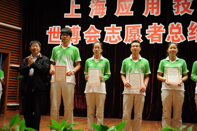 10月15日,学校在奉贤校区举行世博志愿者总结表彰大会,校党委书记祁学银,党委副书记、副院长康年,党委副书记、纪委书记宋敏娟出席大会。祁学银、宋敏娟分别为志愿者优秀团队代表和志愿者之星代表颁发了荣誉证书和纪念徽章。