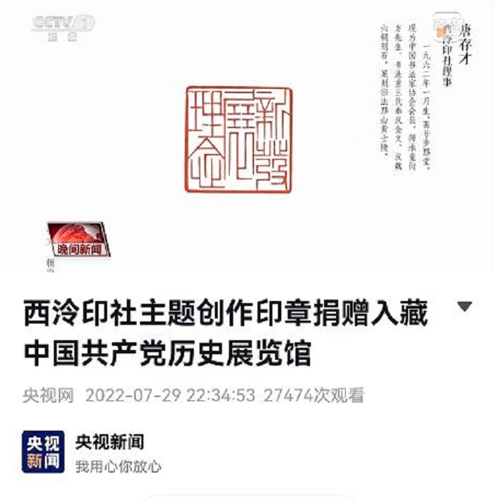 7月29日,央视综合频道《晚间新闻》报道“西泠印社主题创作印章捐赠入藏中国共产党历史展览馆”。此次共三十六件印章作品入藏党史展览馆,我校教师唐存才设计的“新发展理念”朱文篆刻作品荣列其中。