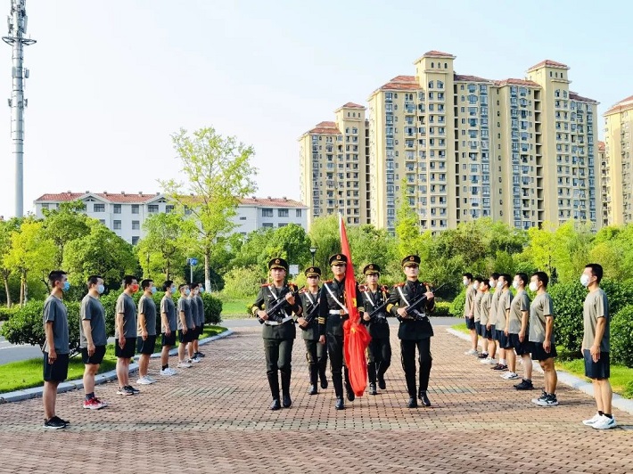 为庆祝中国人民解放军建军95周年,8月1日清晨,在校退役大学生代表、2022年下半年预征报名参军学生等齐聚奉贤校区行政楼前,举行了升国旗仪式。国旗迎着朝霞冉冉升起,在场学生向国旗行军礼,齐唱国歌,鲜艳的五星红旗庄严绚丽,在场师生心潮澎湃。