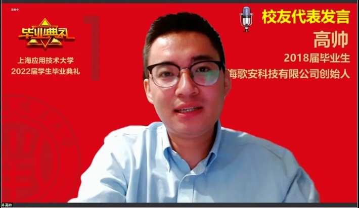 “自信是Z世代青年最成功的教育产物,对民族更自信、对政治更自信、对未来的自己更自信。找到属于自己内心的‘那把火’,让它点亮你的未来。”2018届毕业生、上海歌安科技有限公司创始人高帅作为校友代表发言。他回顾了在学校的求学时光,亲切分享了自己在创业路上的艰苦奋斗,鼓励学弟学妹勇于担当、敏于求知、勤于调研、勇于实践,为人生新的起点全力以赴,敢于做新时代的追梦人。