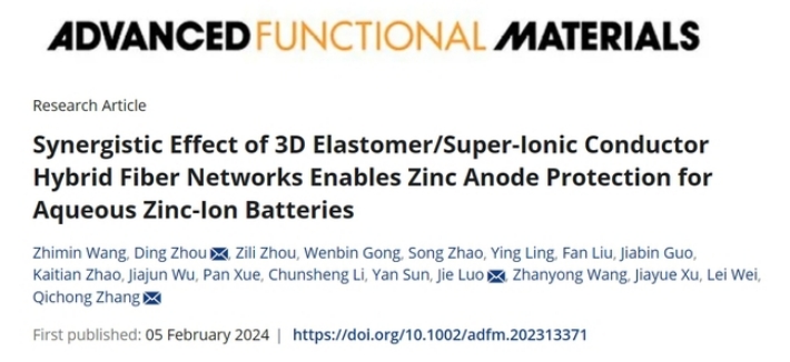 近日,我校材料科学与工程学院在电极材料保护方面取得突破,于材料领域权威期刊Advanced Functional Materials(材料科学1区Top期刊,IF=19)发表题为“Synergistic Effect of 3D Elastomer/Super-Ionic Conductor Hybrid Fiber Networks Enables Zinc Anode Protection for Aqueous Zinc-Ion Batteries”的研究论文。论文第一单位为上海应用技术大学,我校材料学院硕士研究生王智敏为论文第一作者、本科生周自力为第三作者,我校周鼎副教授、苏州纳米所张其冲研究员/罗杰博士为共同通讯作者。